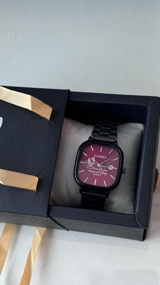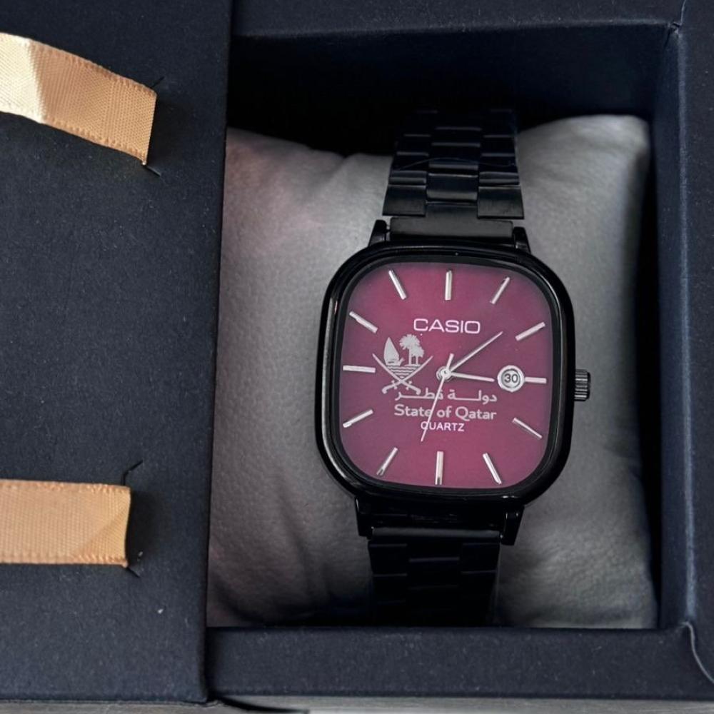 ساعة بشعار قطر السير اسود سير اسود ذات تصميم مميز وعصري مقاومة للماء بشكل سطحي تحكم بمقاس السير بشكل سلس توصلك في باكج مرتب ومناسب للإهداء