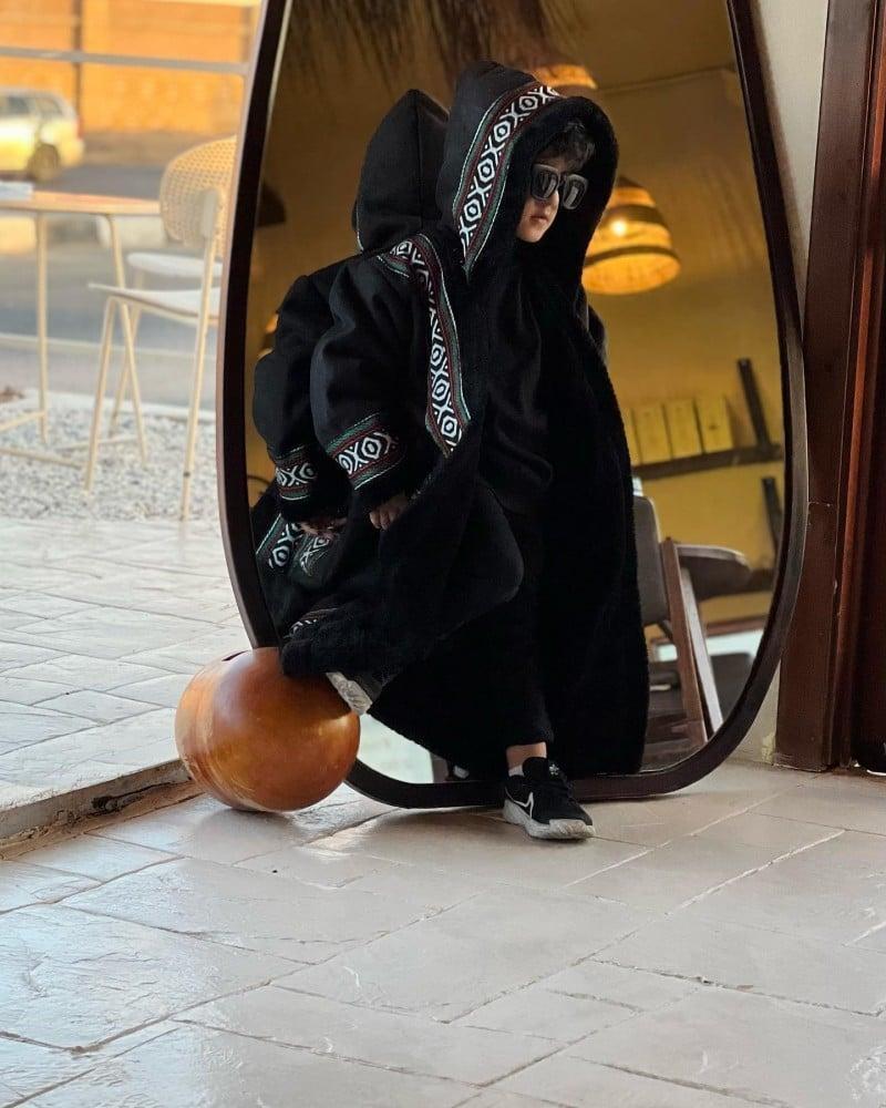حافظ على أناقة وفخامة طفلك في فصل الشتاء مع أرقى فروة شتوية من الداخل فرو باللون الأسود الرصاصي بنقشة السدو البدوية المتألقة مع قبعة الرأس المنقوشة لدفء مضاعف وبتصميم مريح وعملي وفاخر.